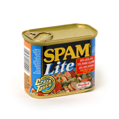 스팸 (라이트) 50% LESS FAT 33% FEWER CALORIES 25% LESS SODIUM Ingredients : Pork with Ham, Mechanically, Separated Chicken, Water, Salt, Modified, Potato Starch, Sugar, Sodium Phosphates, Potassium Chloride, Sodium
