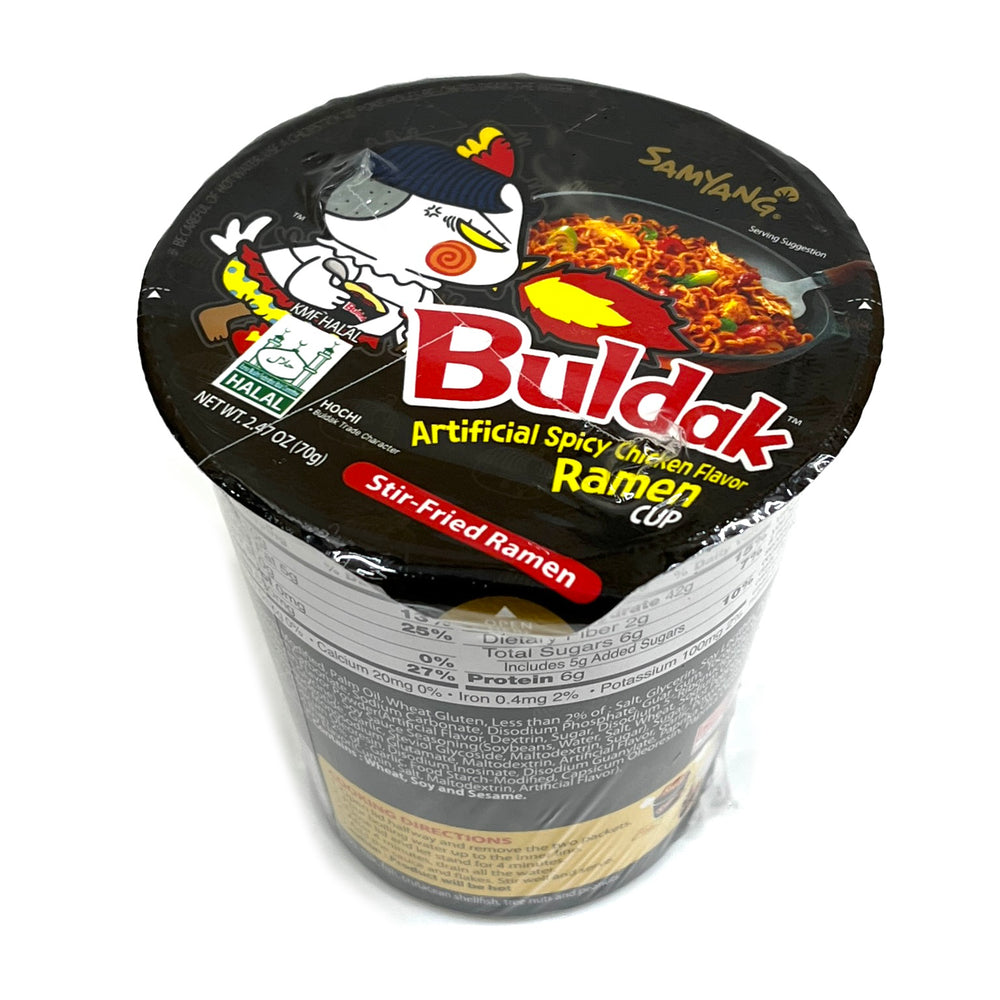 - Samyang Spicy Chicken Noodle Bowl 삼양 컵 불닭 볶음면 70g 면 - 소맥분(미국산,호주산),전분(태국산), 팜유, 활성소맥글루텐,정제염,미감에스유,양파엑기스,면류첨가알카리제(산도조절제), 구아검,비타민B2, 구연산, 녹차풍미유 스프 - 정제수,간장,설탕,그릴치킨농축액,치킨향분말,대두유,하바네로맛시즈닝,양파,고추분,고추씨기름,맛베이스에스,매운고추베이스분말,마늘,지미강화육수분말,변성전분,올레오레진캡시컴, 파프리카추출색소,후추분,치킨카레맛베이스,영양강화제,볶음참깨,구운김{소맥분(밀),탈지대두(대두),난황(계란),우유}